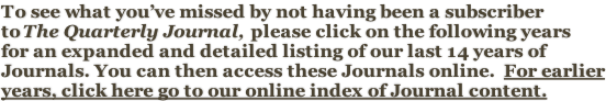 Entire Year of Past Journals: A complete year (four issues of back issues) is available for $20.00 (postpaid). Two years (eight issues) are available for $35.00 (postpaid). Three years (twelve issues) are available for $40.00 (postpaid). Please indicate year desired; for multi-year requests, the years may be consecutive or intermittent; please state years wanted.